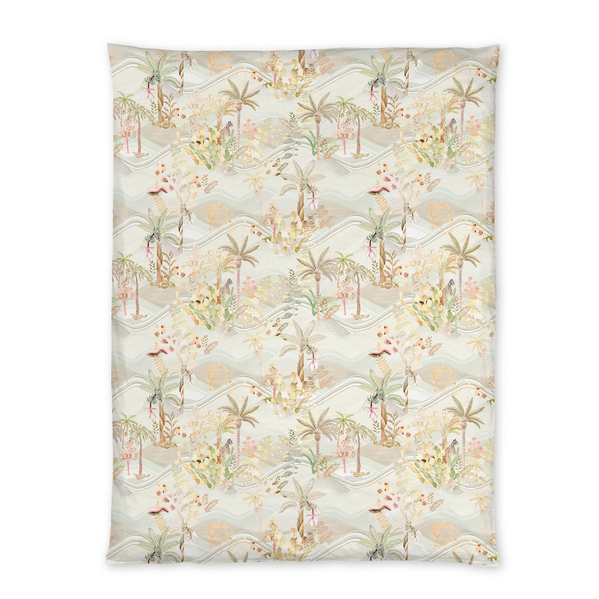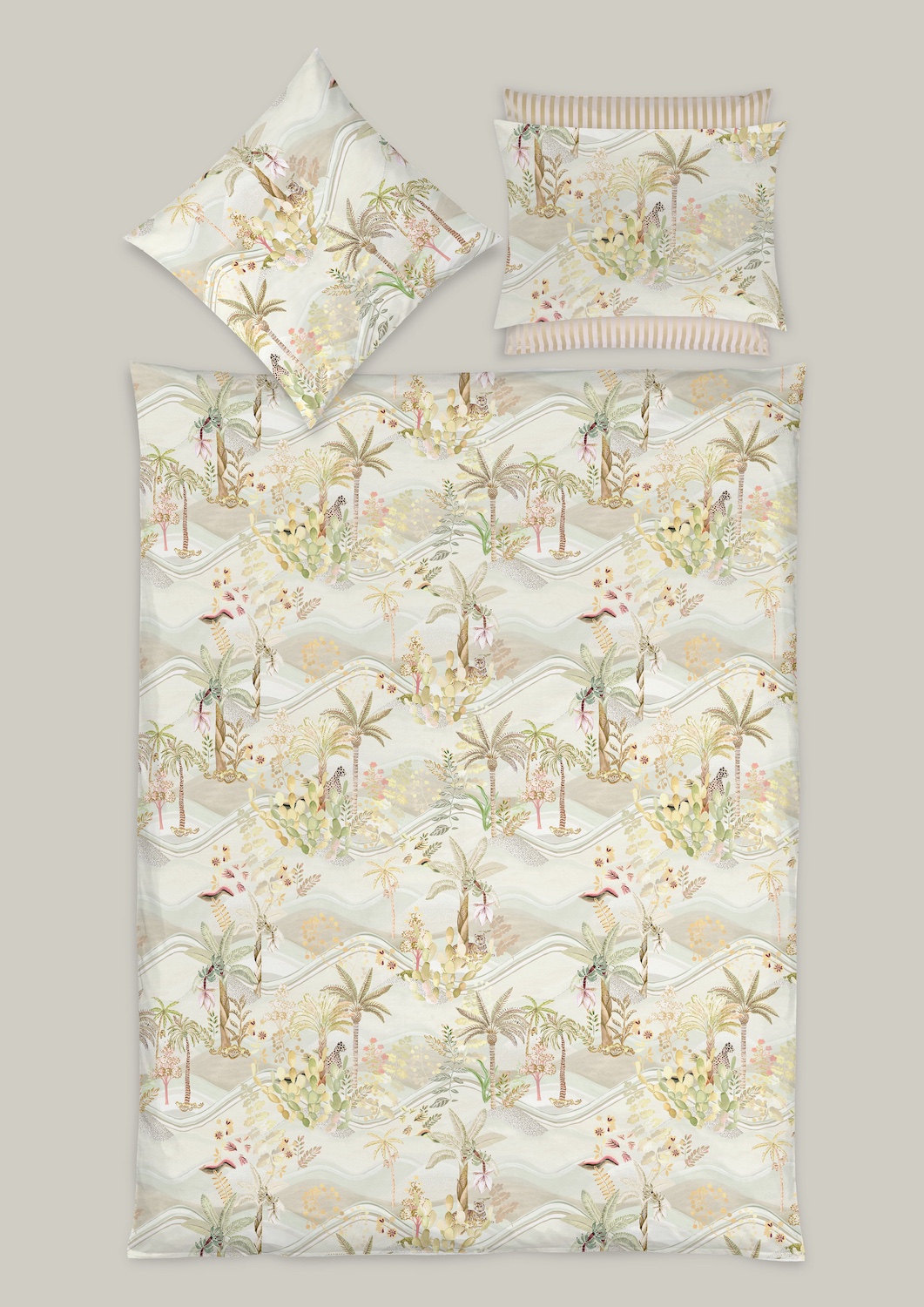 Das Design OASIS entführt in eine bezaubernde Wüstenlandschaft mit sanft wiegenden Palmen, Sukkulenten und stilisierten Blättern. Ein ruhender Tiger und ein getupfter Leopard verleihen der Szene eine majestätische Kraft, welche die Zeit stillstehen lässt. Die Bettwäsche in Sand- und Goldtönen wird mit höchster Sorgfalt und Präzision in Oberitalien gedruckt. Die sanften Farbnuancen und die feinen Details schaffen eine harmonische Verbindung von Natur und Luxus und verleihen das beruhigende Gefühl einer Oase.