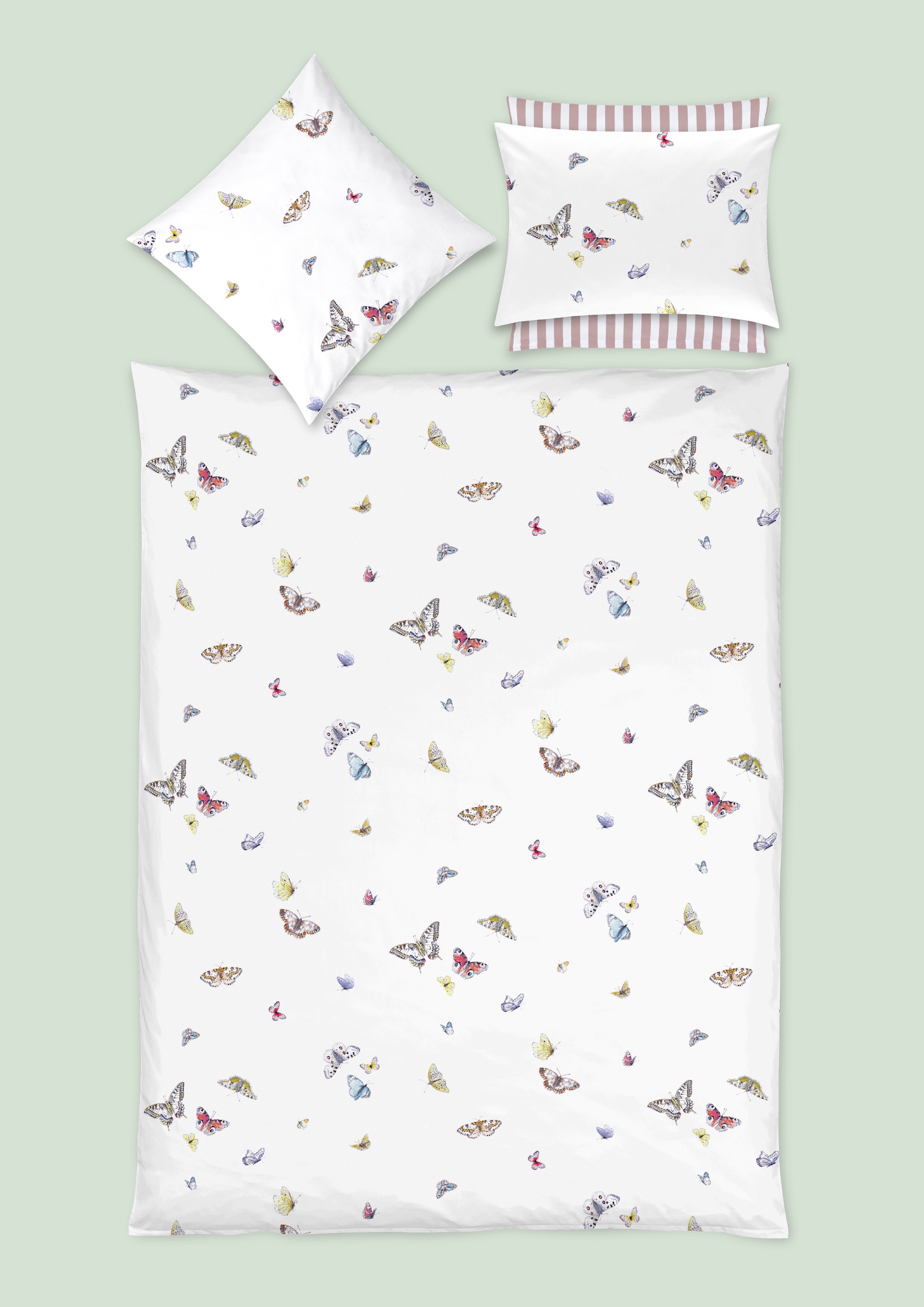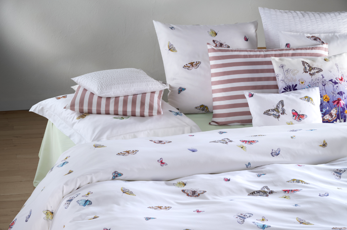 Zart wie ein Flügelschlag entfaltet sich die Schönheit der Schmetterlinge auf dem Design VANESSA. Ihre klangvollen Namen – Admiral, Tagpfauenauge und Distelfalter – erzählen von natürlicher Anmut und Eleganz. Feine Linien und filigrane Punkte zeichnen die Flügel der Edelfalter, die sanft und fast schwerelos auf dem glatten Satin verweilen. In lichten Farbtönen gehalten, verleihen sie dem Schlafzimmer einen Hauch von Sommer und Freiheit.